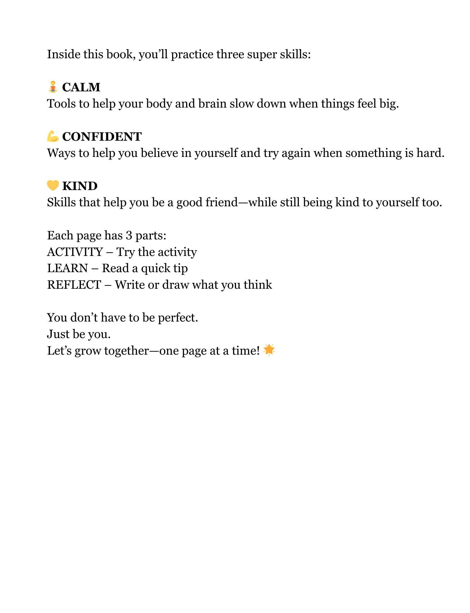 Calm, Confident, Kind is a gentle, engaging feelings workbook designed to help children recognize their emotions, express themselves safely, and build healthy coping skills through fun, hands-on activities.